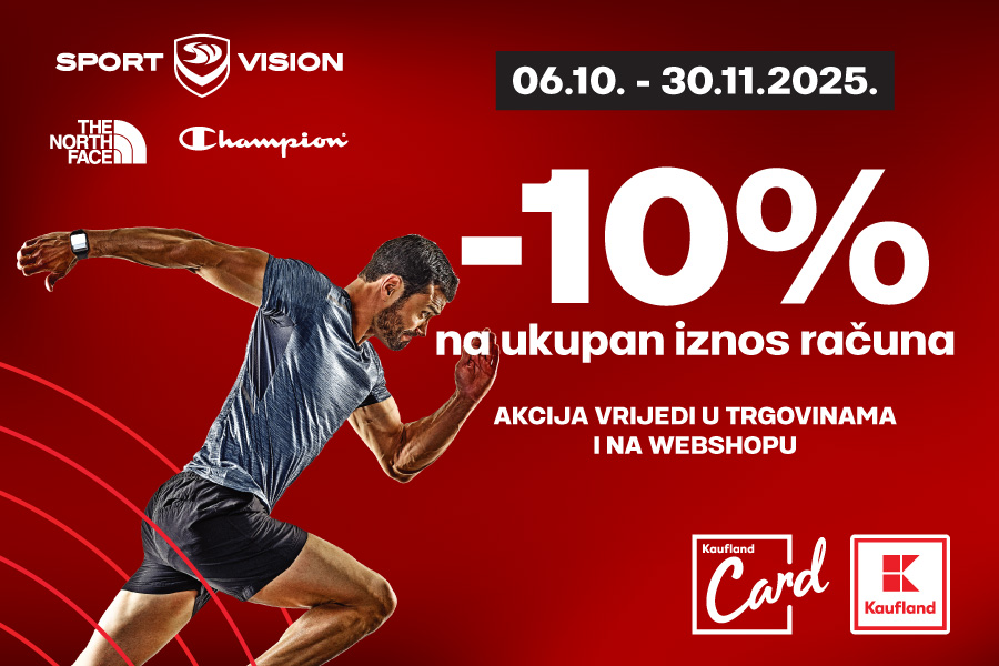 U periodu od 6. listopada do 30. studenoga 2025., iskoristi -10% popusta na ukupan iznos računa u Champion, The North Face i Sport Vision trgovinama i na webshopu — uz predočenje svoje Kaufland Card kartice!